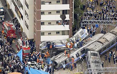 רכבת ובה מאות נוסעים שסטתה ממסילתה מסיבה שאינה ברורה, התנגשה בבניין דירות, וגרמה לתאונה החמורה ביותר שארעה ביפן ב-14 השנים האחרונות. גורמים רשמיים העריכו כי מספר ההרוגים רק יעלה