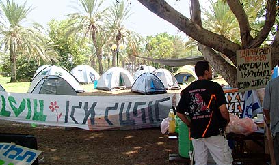 נעמי, יחד עם כמה מחבריה מנצר חזני, הגיעה אתמול לרכבת מרכז בתל-אביב, שם הקימו המפונים עיר אוהלים. ממבט ראשון, המאהל שהקימו שמונה המשפחות על הדשא נראה כמו מחנה קיץ מאורגן שבחר להתמקם דווקא באמצע העיר. עשרות ילדים מתרוצצים על הדשא, משליכים בלוני מים, משחקים עם מתנדבות "בני עקיבא" שהגיעו למקום. מולם, על השולחן הגדול, פרושה תקרובת בורקסים, כדורי שוקולד ושתייה שלא היתה מביישת אף מסיבת יום הולדת בפארק הירקון. רק החולצות השחורות-כתומות שעליהן נכתב "יהודי גירש אותי מהבית", חושפות כי מדובר בעצם במאהל מחאה ולא בקייטנה.