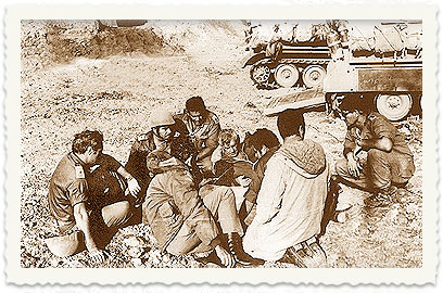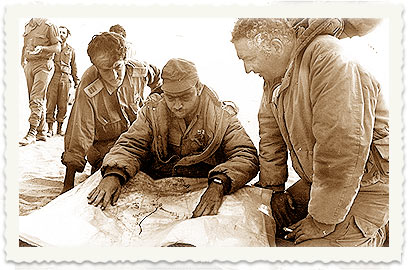 בבוקר ה-16 לאוקטובר מגיעים ראשוני הטנקים לחצר מוצב "מצמד", שעל חוף אגם תמסח בכניסה לתעלת סואץ. למצרים בשלב זה עדיין אין מושג על המתרחש מתחת לאפם. בתצלום: אריק שרון, אברשה תמיר, שלמה להט ומפקדים נוספים מהאוגדה מתכננים מהלכים בחצר הצליחה. זמן קצר לאחר שצולמה התמונה מופגזת החצר ויש נפגעים.