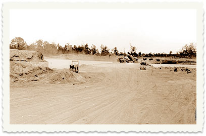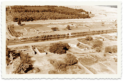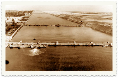 מיד עם חציית תעלת סואץ (תמונות מצד ימין) נמצאת תעלת מים מתוקים, אותה ניתן לעבור רק על גשרים. בתמונה: אזור החיץ החקלאי הכולל כפרים, שדרות עצים ושדות המושקים בהצפה.