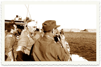 שר הבטחון משה דיין בביקור בגזרה, שט על אגם תמסח לצד מפקד האוגדה אריק שרון ורמ"ט האוגדה אברשה תמיר.