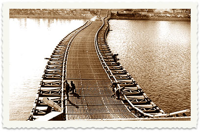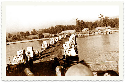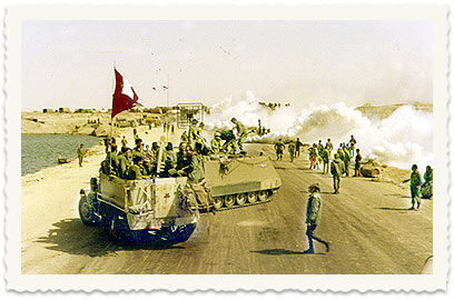 כחצי שנה מתחילת המלחמה ולאחר חתימת הסכמי הפסקת האש בק"מ ה-101, חוזרים כוחותינו למזרח התעלה. בתצלום: שמחת הלוחמים בעת חציית הגשר היבשתי על התעלה.