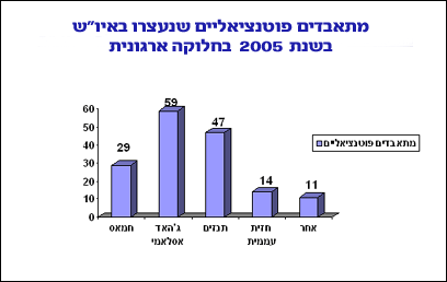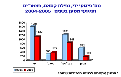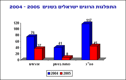 לפי מערכת הביטחון, רמת המוטיבציה בקרב ארגוני הטרור לפגוע במטרות ישראליות לא השתנתה השנה ורמת ההתרעות החודשית היתה גבוהה. עם זאת, קיימת ירידה משמעותית בכמות הנפגעים הישראלים. במהלך 2005 נהרגו 45 ישראלים בהשוואה ל-117 הרוגים ב-2004.