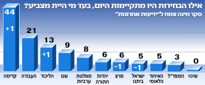 סקר "ידיעות אחרונות" ומכון דחף מגלה שקדימה מתחזקת בעוד מנדט ומתייצבת על 44 מנדטים. הרחק מאחוריה העבודה עם 21 מנדטים. הליכוד מתחזק במנדט ל-13 מנדטים. מרצ וישראל ביתנו נחלשות ושינוי יציבה על 0 מנדטים
