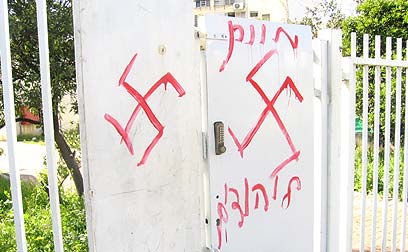צלבי הקרס והכתובות בפתח תקווה (צילום: משה ליכטנשטט)