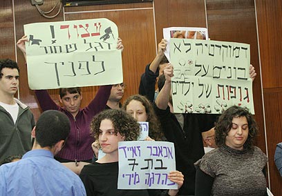 מפגינים מול מופז (צילום: אלי אלגרט)