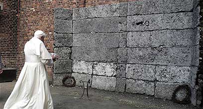 האפיפיור מול קיר המוות באושוויץ (צילום: איי.פי)