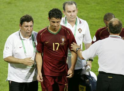כריסטיאנו רונאלדו, שספג בפתיחה תיקול ממרק ואן בומל, 'טופל' שוב על ידי הגנת הולנד ונאלץ לצאת לטיפול של עשר דקות מחוץ לקווים, עד שעלה שוב למגרש.