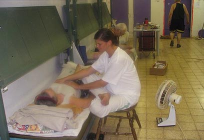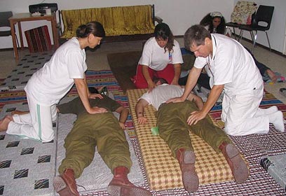 מטפלי המגע ירדו למקלט שליד חדר האוכל. ההומאופתים התמסרו למטפלים המותשים של ההוסטל לאנשים עם פיגור הפועל ביישוב שלא נחו זה שבועיים, ולמספר ילדים ומבוגרים שסבלו מחרדות.