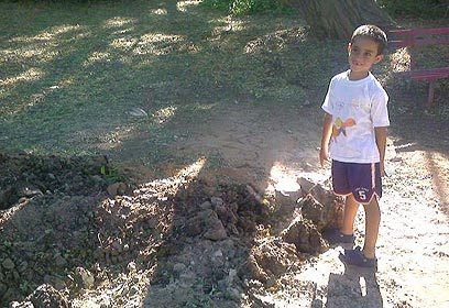 אחד מילדי מחניים מצביע על מקום נפילת קטיושה בקיבוץ (צילום: יוסי תומר)