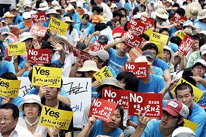הפגנה בדרום קוריאה נגד ביקור קואיזומי במקדש, הבוקר (צילום: איי.פי)