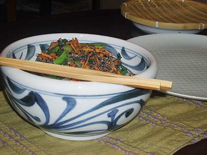 - הגשה: לוקחים מעט אטריות קרות בעזרת מקלות האכילה, טובלים ברוטב ואוכלים.