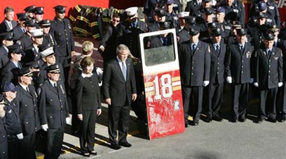 אתמול השתתף נשיא ארצות הברית באירועי יום הזיכרון לציון ה-11 בספטמבר. הוא ביקר בתחנת הכיבוי "פורט פיט" בלואר איסט סייד במנהטן והשתתף בטקס זיכרון יחד עם כבאים ושוטרים שהיו בין הראשונים בזירת הפיגועים ואיבדו רבים מחבריהם. מאוחר יותר עמד דום והאזין לקטע קריאה של רב מול דלת שחולצה ממשאית כיבוי שנקברה תחת הריסות המגדלים.