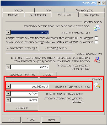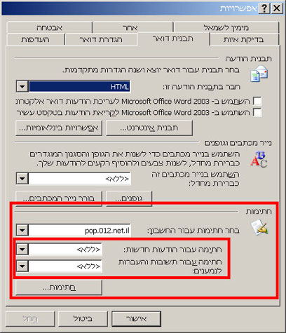 נכנסים לכלים>אפשרויות>תבנית דואר. ניגשים לתחתית החלון, לחלק שתחת הכותרת "חתימות".
