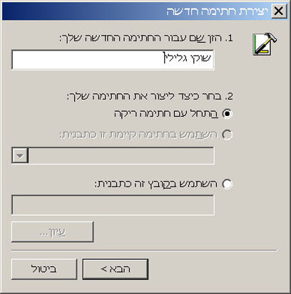 הקלידו את השם הרצוי לחתימה (השם שיוצג לכם בתוכנה, לא השם שיוצג בחתימה עצמה) והקליקו על הבא (שימו לב שבאותו חלון תוכלו גם לבחור להתבסס כתבנית על חתימה שכבר יצרתם, או על חתימה מקובץ HTML - אפשרות פחות מומלצת בגלל הנטייה של מסנני ספאם לחסום הודעות עם חתימות כאלה).