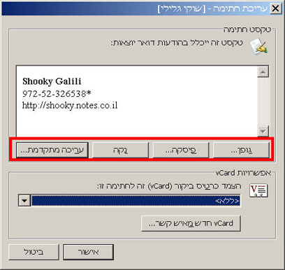 בחלון שמופיע תוכלו להזין את הטקסט של החתימה לפי רצונכם - שמכם, מספרי הטלפון שלכם, כתובת האתר, תפקידכם (אם זו חתימה במקום העבודה).