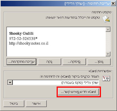 ב-vCard שלכם, תוכלו לכלול מידע רב יותר, בלי לנפח את החתימה שלכם. כדי לשמור את ה-vCard כפריט ברשימת אנשי הקשר יש להקליק עליו הקלקה כפולה, ואז ללחוץ על הכפתור שמור וסגור.
