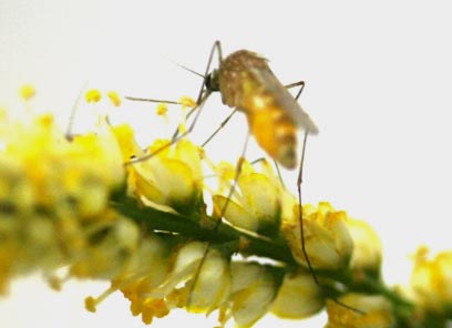 יתוש ניזון מתמיסת סוכר בתוספת צבע מאכל צהוב שרוסס על ענפי העץ (צילום: גונתר מילר ויוסף שליין)