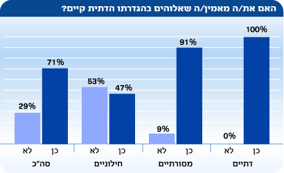 מה אומרות התוצאות? לשאלה "האם אתה מאמין שאלוהים בהגדרתו הדתית קיים?" השיבו 71% בחיוב ו-29% בשלילה. 100% מהדתיים, יחד עם 91% מהמסורתיים ו-47% מהחילונים מאמינים בקיומו של האל. מה שאומר שכמחצית ממי שמגדירים עצמם "חילונים" מאמינים בקיום אלוהים.