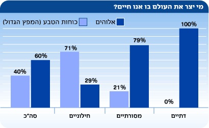 לגבי השאלה "מי יצר את העולם שבו אנחנו חיים?", השיבו 60% כי מדובר באלוהים, ו-40% תמכו בכוחות הטבע (קרי המפץ הגדול). 100% מהדתיים, 79% מהמסורתיים ו-29% מהחילונים אמרו שהם מאמינים כי אלוהים ברא את העולם.