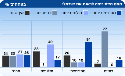 לגבי השאלה "כיצד היית רוצה לראות את ישראל?" היתה חלוקה שווה: 26% השיבו כי היו רוצים לראות ישראל מסורתית יותר, 27% רוצים ישראל חילונית יותר, 23% רוצים ישראל דתית יותר ו-24% לא חפצים כלל בשינוי. כל אחד והגישה שלו...