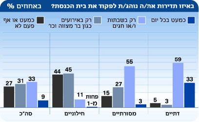 הנתונים האלה מעניינים כי הם מצביעים על תופעה, שחורגת מהתקרבות "רגילה" לדת. והראיה, לגבי ביקור בבית הכנסת השיבו רק 9% כי הם עושים זאת מידי יום, 33% השיבו כי הם עושים זאת רק בשבתות וחגים, 31% אמרו "רק באירועים ובר מצוות" ו-27% כמעט ואינם פוקדים אותו. שתי התשובות המובילות בקרב החילונים הן "באירועים ובר מצוות" (45%) ו"כמעט אף פעם לא" (44%). מהצד השני, 15% מהמסורתיים מודים כי הם כמעט ואינם פוקדים את בית הכנסת, וכן 5% מהדתיים.