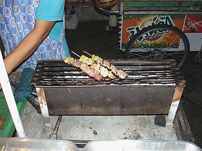 מאוחר יותר, בערב, בקאו-סאן. אנחנו מתנהלים בעצלתיים בין תיירים, מקומיים שבאו לבלות וכאלה שבאו לעבוד. אנחנו מוותרים על הפאד תאי הצמחוני שמוכרים בקאו-סאן (בלי רוטב דגים זה ממש לא זה), ואני קונה שני שיפודים מכל סוג - לא ברור לי איך מתבלים אותם ומה עושים להם, אבל הם כל כך טעימים – נתח דקיק של בשר (עוף, בקר, חזיר), שמשופד על שיפוד במבוק קטן כשבסופו חתיכה של צ'ילי, פיסת אננס ו/או עגבניית שרי – מיני ארוחה על שיפוד. מזמינים כמה שרוצים (בערך שקל ליחידה), ממתינים דקה עד שהם ניצלים ומקבלים אותם בתוך שקית ניילון קטנה. מי שרוצה מקבל זילוף של רוטב צ'ילי כתום וחריף (נאם-פיק סי ראצ'ה) לתוך השקית. אחלה דרך להתחיל, להמשיך ולסיים ערב.