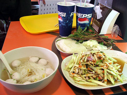 כבר 12 שעות שלא אכלתי סלט פפאיה. אני מחפש דוכן עם עלי ומכתש ומוצא אותו בקלות. הדוכן מציע סוגים שונים של סלט פפאיה – החל ברגיל וכלה בכזה שמכיל סרטנים מומלחים. מלבד סלט הפפאיה, יש גם סלט מנגו ירוק (לא בשל). המנגו חתוך לנתחים עבים יחסית ולמרות שהוא אינו מתוק, בהחלט ניתן להבחין בטעמו האופייני של הפרי.