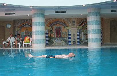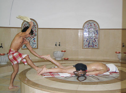 מיקי המטפל, שעבר הכשרה מיוחדת על מנת ליישם את שיטת העיסוי כהלכתה, שוטף את המטופל מסבן את עורו בעזרת מברשת שיער דמוית שוט, מקרצף בליפה קשה ולבסוף מצליף בעוז על הגב והרגליים להאצת זרם הדם. טמפרטורת החלל שעומדת על 42 מעלות באופן קבוע מוסיפה גם היא לחדוות זרימת הדם. מחירי טיפולים 130-220 שקל. כניסה לאורחים שאינם שוהים במלון, בתיאום מראש. טל. 6993000־.04