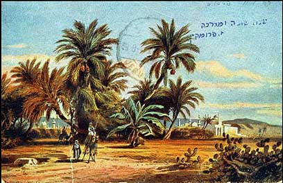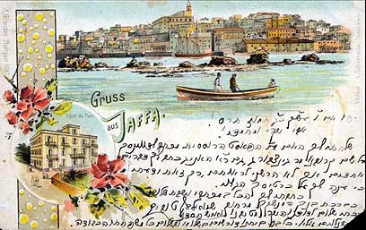 כיתוב על גב התמונה: "שלום לידידי היקרים - הגברת זהבה ואחיה ברוך בן טובים, מה שלומכם יקירי?....היוסף שלי נסע היום לביירוט, על איזו יומיים. שלום לכם ולכל משפחתכם. כתבו לנו לפעמים מכל הנשמע בירושלים. ידידכם ציפורה ליפשיץ. חיפה, ט' באייר, תרס"ח". (1908)