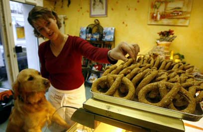 במעדניית הכלבים של יאנין סרניטי-לגרין בעיר וייסבאדן בגרמניה מוכרים שלל רקיקים ותופינים - לכלבים. על בקרת האיכות משגיחה מקרוב כלבתה של הבעלים, רוניה. להסתכל - וללקק את האצבעות