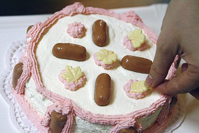 עוגת יום הולדת מעוטרת בפרלינים משוקולד לבן, ובנקניקיות (צילום: רויטרס)