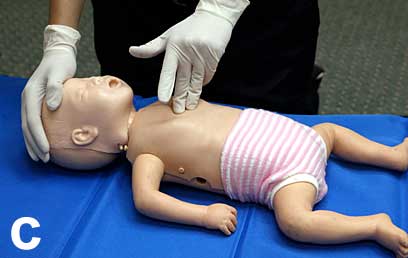מקמו את האצבעות בקו האמצע של בית החזה, על עצם החזה בין שתי הפטמות. בעת ביצוע העיסוי יש ללחוץ על עצם החזה בקצב של 100 לחיצות בדקה, במקביל להנשמות. היחס אצל תינוק הוא שתי הנשמות לכל 30 עיסויים. המשיכו בעיסויים ובהנשמות, עד להגעת צוותי מד"א למקום.
