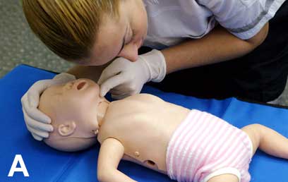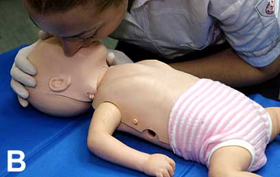 הניחו את פיכם מסביב לפיו ולאפו של התינוק ובצעו באיטיות שתי נשיפות בנפח שמספיק כדי לגרום להתרוממות בית החזה של התינוק. חשוב לזכור שנשיפות בעוצמה רבה מדי עלולות לגרום נזק ישיר לריאות ולהביא לדחיסת אוויר מיותרת לקיבתו של התינוק. לכן מומלץ לנשוף באיטיות ולא בחוזקה.
