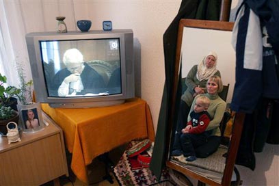 נשים בוסניות צופות בפסק הדין בטלוויזיה (צילום: איי.פי)