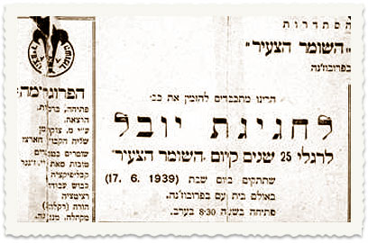 הזמנה לחגיגת מחצית היובל לקן השומר הצעיר בפרובוז'נה אשר תתקיים ביום שבת, 17 ליוני 1939