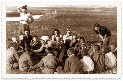 שרה עם קבוצת ילדים בבית הילדים "אוולקה"