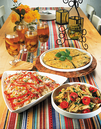 ארוחה משאריות ליל אמש: סלט פסטה קר, אורז מוקפץ עם ירקות, קומפוט מפירות בשלים מדי ופריטטה משאריות תפוחי אדמה מבושלים. הפקה וסגנון: נטשה חיימוביץ'; צילום: יוסי סליס