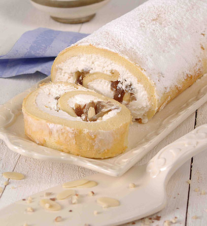 - מניחים את הרולדה המוכנה כשהחיבור למטה על מגש, בוזקים מעט אבקת סוכר על הרולדה ומגישים.