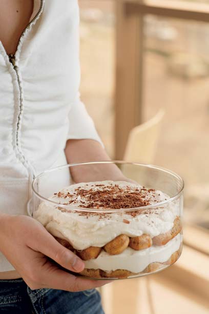 - יוצקים מחצית מתערובת הגבינה ומכסים בשכבה נוספת של בישקוטים טבולים בתערובת הליקר.