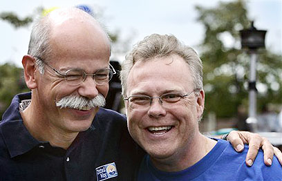 טום לה-סורדה (מנכ"ל קרייזלר, מימין) ודייטר זטשה, יו"ר דיימלר-קרייזלר, בימים שהחיוך בא בטבעיות (צילום: איי פי)