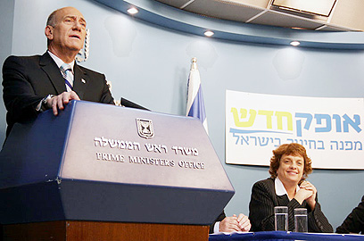 "מהפך דרמטי". אולמרט ותמיר במסיבת העיתונאים (צילום: דודי וקנין)