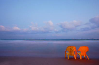התמונה צולמה בחמש בבוקר. בדמיוני ראיתי את שני הכיסאות מביטים אל האופק, המים זרמו ברכות והעננים נעמדו אל מול חוף פרישמן