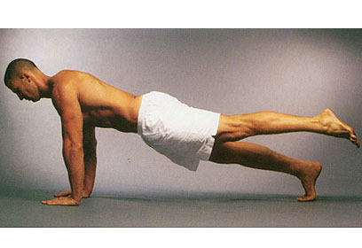 התרגיל: מעבירים את המשקל קדימה, עד שהכתפיים ממוקמות מעל כפות הידיים. בשאיפה מכופפים ברך אל החזה ומיישרים לאחור.