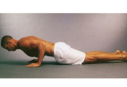התרגיל: מכופפים מרפקים לאחור ומעבירים את המשקל קדימה, כך שהכתפיים יהיו בקו אחד עם כפות הידיים. כשהגו בגובה המרפקים, מחליקים את הברכיים לאחור עד למצב של שכיבה על הבטן. נשארים במנח למשך עשר שניות, ובין סט לסט מחליקים את הישבן לעבר העקבים ופושטים את הזרועות קדימה.