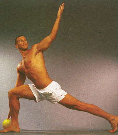התרגיל: שולחים את רגל ימין קדימה (זווית של 90 מעלות בין השוק לירך), שואפים ומעבירים את המשקל אל הרגל הקדמית תוך העלאת הזרועות מעבר לראש, מבט קדימה. מורידים את הזרועות לרצפה כך שהברך ביניהן, ומניחים את יד ימין על הכדור. עם השאיפה מסובבים את הגב לצד ימין, תוך פתיחת החזה והזרוע השמאלית.