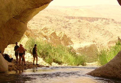 אבן החול הוא סלע שבו מים יכולים להיספג בקלות. אין זה פלא, גרגרי החול גדולים יחסית למולקולות הגיר ומים יכולים להיספג בניהם כמו בספוג ענקי. כל פעם שהנחל חותך באבן החול נובעות מדפנות הקניון מלא נביעות זעירות. אנחנו ממלאים בקבוקי מים לשתיה מנביעות אלו, כך אנחנו בטוחים שהמים שנשתה לא התערבבו בגללי עיזים. לרגלי הנביעות צומחים עצי דקל גדולים, שכמו נשתלו על דפנות הקניון ופורצים למעט השמים שנתחמו בין קירות הסלע. הגנים התלויים בבבל נחשבו כאחד משבעת פלאי העולם העתיק. הגנים התלויים על קירות הקניונים בירדן יכולים להתחרות בהם בהצלחה.