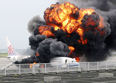 מטוס של חברת התעופה הטייוואנית "צ'יינה איירליינס" התלקח בעת שנחת בנמל התעופה באי אוקינאווה שבדרום יפן. שמונת אנשי הצוות הספיקו לפנות את כל הנוסעים - וגם את עצמם - רגע לפני שהמטוס התפוצץ ונקרע לגזרים