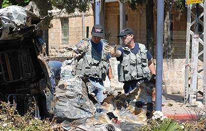 חבלני המשטרה ליד הרכב שהתפוצץ (צילום: דורון גולן)