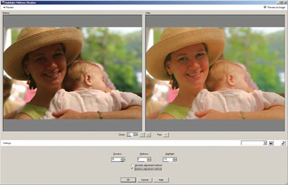אור אחורי הוא בעיה נפוצה נוספת, בה נתקלים כל הצלמים. תוכנות העריכה מציעות התאמות של בהירות וניגודיות, אבל הן מתבצעות באופן אחיד על כל התמונה. אם תגבירו את הבהירות הכללית, על מנת לראות פנים כהים בצורה טובה יותר, האור ברקע מוגבר מאוד, ומאבדים פרטים. במקום זאת, על מנת לתקן את האור שבא מאחור, יש להגביר את הבהירות באזורים החשוכים (הצללים) ולהשאיר את האזורים הבהירים יותר ללא הגברה נוספת. הכלי Highlight/Midtone/Shadow בתוכנת Corel Paint Shop Pro, כמו גם כלים אחרים בתוכנות אחרות, עושה בדיוק את זה
